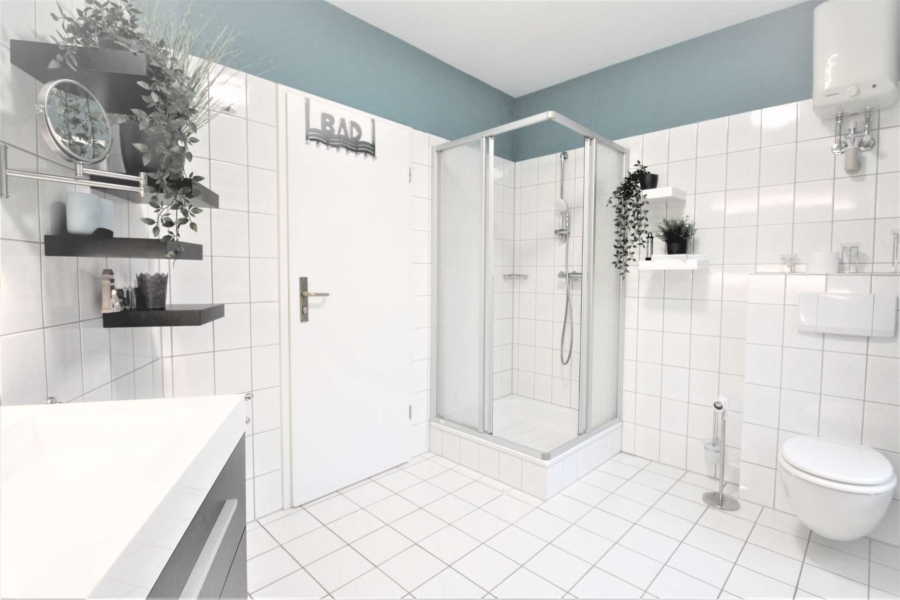 - Geräumiges, weiß gefliestes Bad mit großem Waschtisch und Dusche